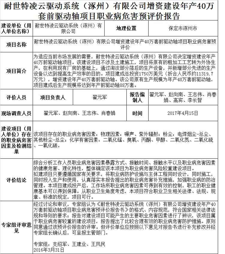 耐世特凌云驱动系统(涿州)有限公司增资建设年产40万套前驱动轴项目职业病危害预评价